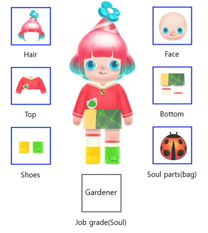 The avatar parts consist of a total of six spots, and users can customize their avatars by swapping parts 1:1 within the same spot (simple detachment is not possible). Among the six spots, the [Bag] spot is reserved for occupation-specific Soul Parts, which can only be equipped by avatars with that job.