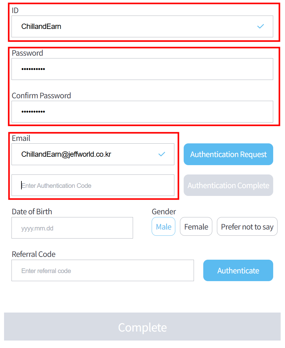 Check your email and enter the 6-digit verification code. Once the correct code is entered, the <mark style="background-color:blue;">**\[Authentication Complete]**</mark> button will be activated. Click to complete your email verification.
