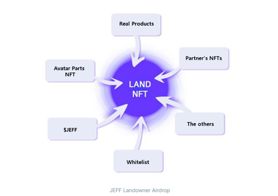 Landowners will be the top priority for all airdrops. As the JEFFWorld ecosystem expands, Landowners can expect to receive various benefits such as $JEFF, Avatar parts NFTs, partner’s NFTs, Whitelist, Real Products, and more.