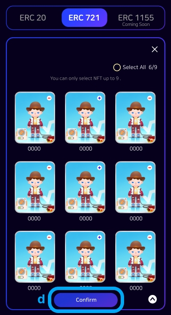 d. NFT Collection ํด๋ฆญ ์, NFT ์ ํ ์ฐฝ์ด ์คํ๋๋ฉฐ ํด๋น ์ฐฝ์์ ์์ ์ด ์ ์กํ๊ณ ์ ํ๋ NFT๋ฅผ ์ ํํฉ๋๋ค. NFT๋ ์ต๋ 9๊ฐ๊น์ง ์ ํํ ์ ์์ต๋๋ค.